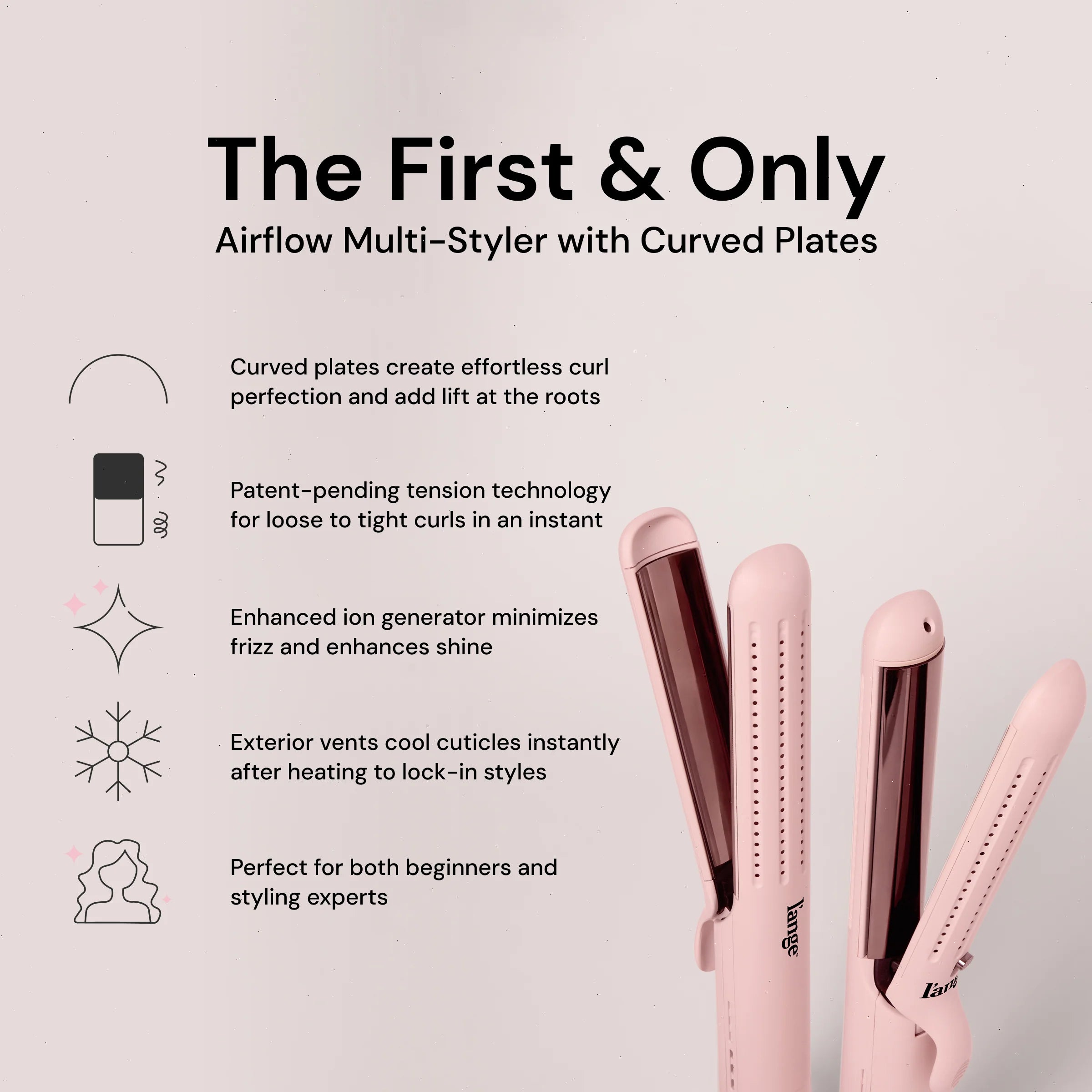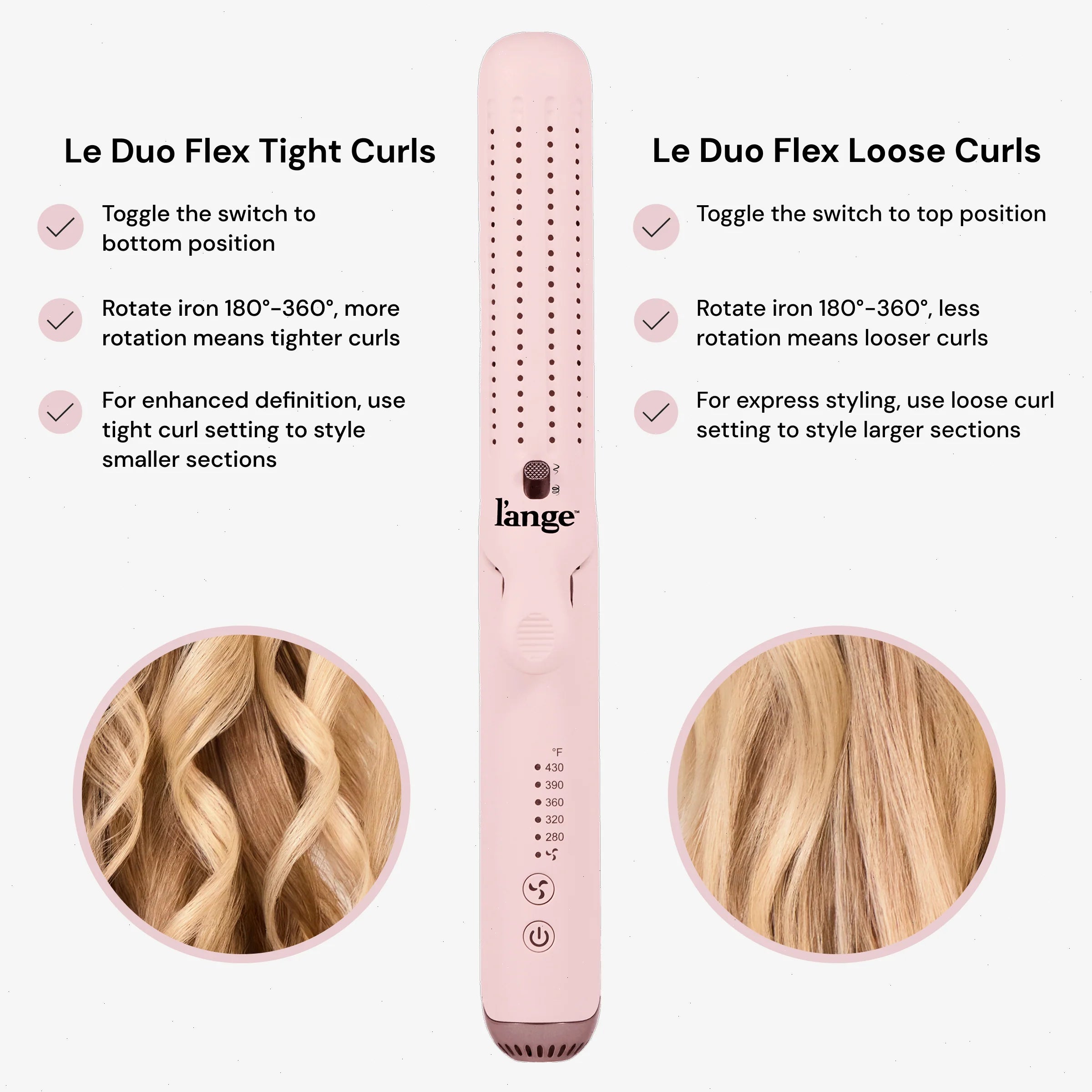 Flex your curls and create waves, curls, and everything in between with Le Duo Flex. This innovative, patent-pending curler lets you effortlessly create both loose waves and tight curls at the simple flip of a switch. As the first and only 360° airflow multi-styler with curved titanium plates, it was designed to gently contour to your hair for seamless styling—perfect for both beginners and styling experts. Style-locking cooling vents set your look in place, while the enhanced ion generator boosts shine and tames frizz for a flawless, long-lasting finish. Le Duo Flex comes in one size that works for all hair lengths–the only size you’ll need to perfect your look.