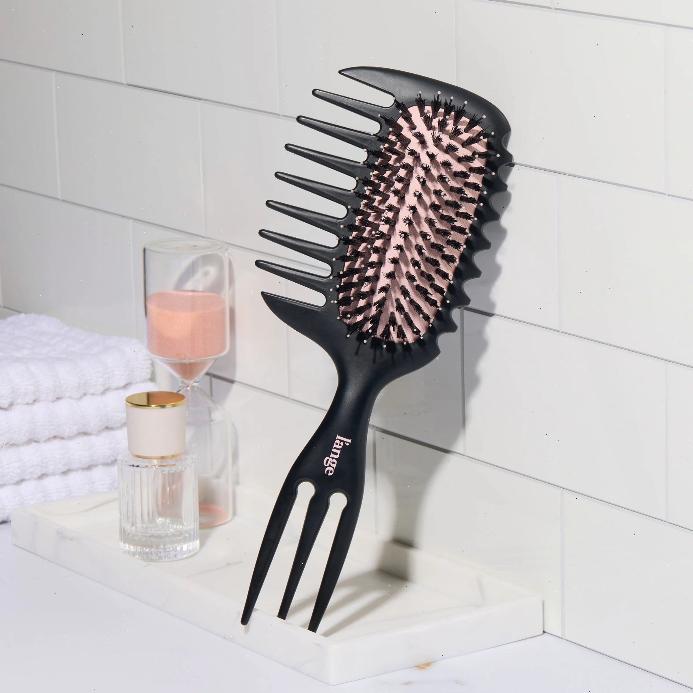 Maintain and define your curls while also volumizing with this dynamic 3-in-1 tool. The nylon and soft boar bristle combination ensures smooth control with less breakage while creating bouncy, defined curls. The wide-tooth comb gently detangles. The waved edge provides curl definition in tandem with the styling grooves on the back of the paddle. The ergonomic handle includes a three-pronged pick for instant volume or lifting curls when needed.